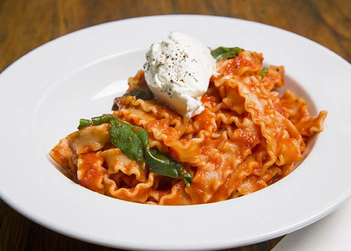 פנה / ספגטי ברוטב עגבניות, חצילים, עגבניות טריות, גבינת ריקוטה, זיתי קלמטה ובזיליקום