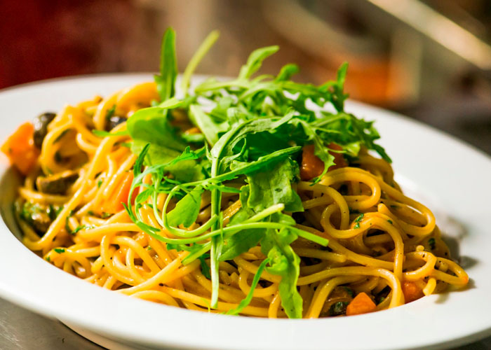ספגטי בשמן זית, פסטו, קישואים, ארטישוק, ברוקולי, עגבניות מיובשות ותרד