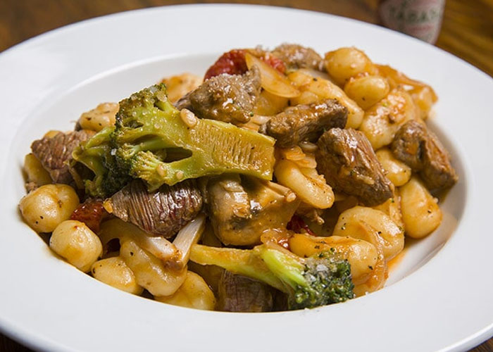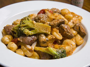 ניוקי בשמן זית, ברנדי, טבסקו ומעט רוטב עגבניות, קוביות פילה בקר, ברוקולי, בצל, פטריות שמפיניון ועגבניות מיובשות - חריף!