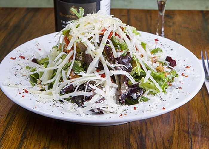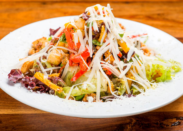 תערובת חסות, קרוטונים, אגוזי מלך, פלפלים קלויים ועיטורי פרמזן ברוטב ויניגרט בזיליקום (מתקתק)
