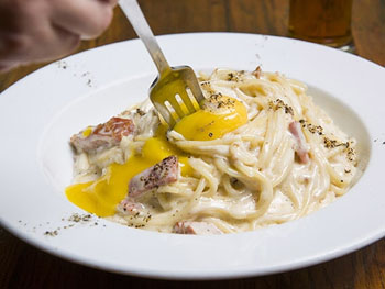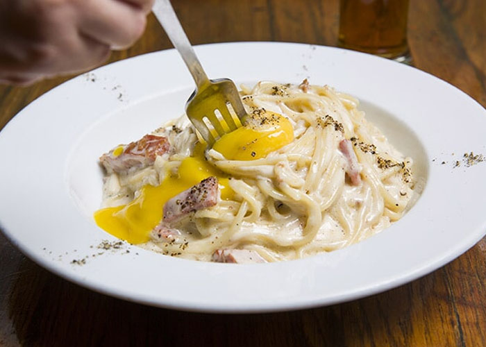 ספגטי בשמנת, חזה אווז מעושן וחלמון ביצה