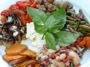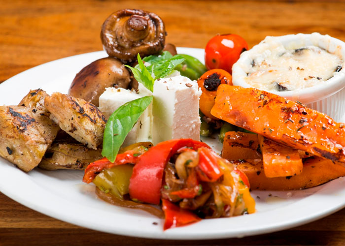 חצילים בפרמזן, בטטה עם טימין, פטריות שמפיניון, פלפלים , שום קונפי, ארטישוק,שעועית ירוקה עם עגבניות שרי וזיתי קלמטה, גזר וגבינת פטה