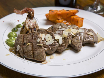 נתחי פילה בקר מיושן (כ 250- גרם) עם בצל קלוי, מעוטרים בשקדים מוגש עם בטטה בגריל, סלט ירוק ורוטב ויניגרט בזיליקום (הרוטב מתקתק, מוגש בצד)