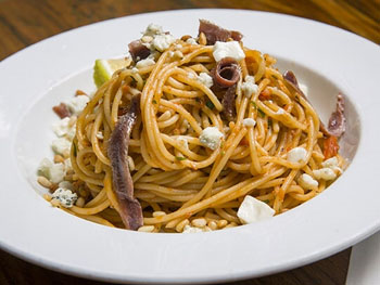ספגטי בשמן זית, אנשובי, מוצרלה, גבינת רוקפור, טפנד עגבניות, פטרוזיליה וצנוברים