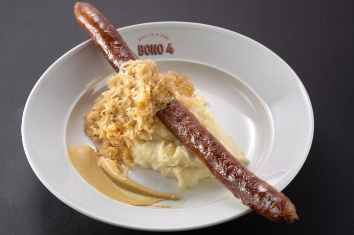 250 גרם נקנקייה צלויה על הפלנצ'ה עם פירה, כרוב כבוש מתובל וחרדל