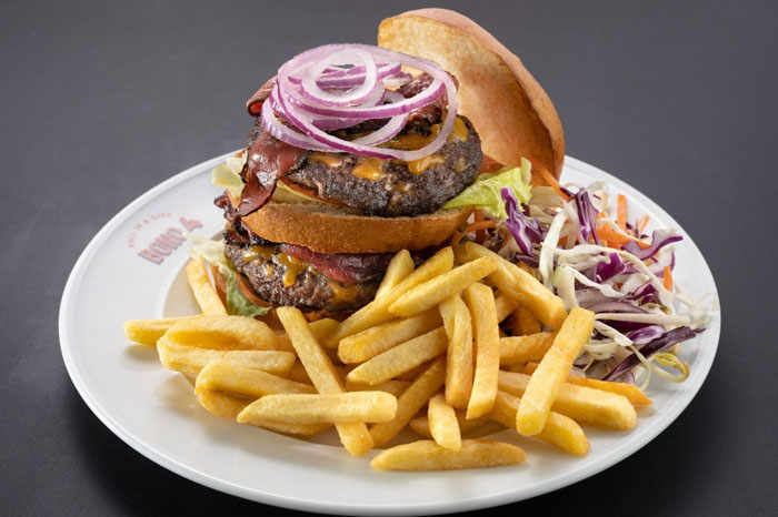 2 קומות של המבורגרים בלחמנית בריוש מתקתקה, יחד עם פרוסות של קורנדביף פלנצ'ה, גבינת צ'דר אנגלי/ טבעוני, איולי שום, איולי צ'יפוטלה, חסה עגבניה ובצל