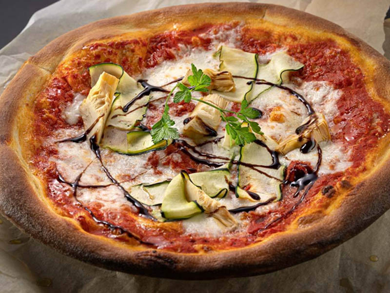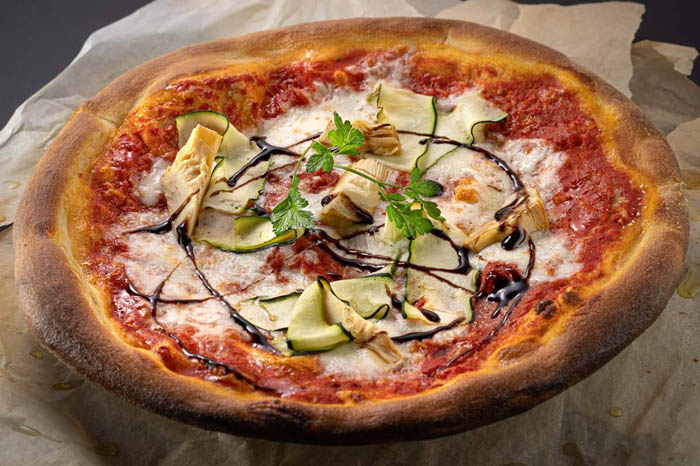 רוטב עגבניות, קוביות בטטה, פלפל קלוי, פטריות מוקפצות ומוצרלה טבעונית