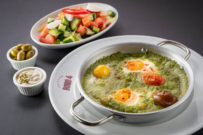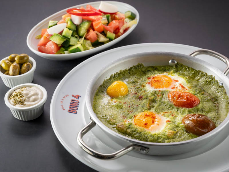2 ביצים, קרם תרד, גבינת פרמזן, ועגבניות שרי צלויות.