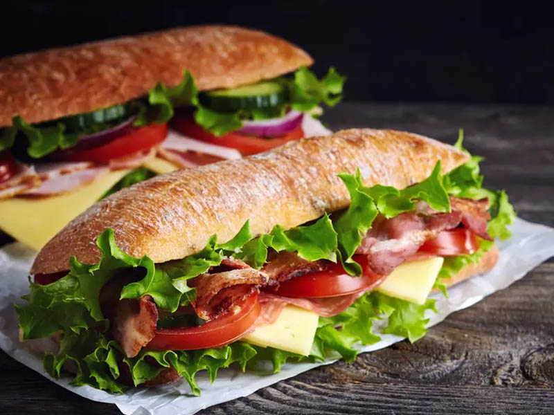 כריך כפול של פסטרמי הודו וקורנדביף עסיסי בלחם קסטן קלוי יחד עם עלי חסה, עגבניה, מלפפון חמוץ, איולי שום וחרדל